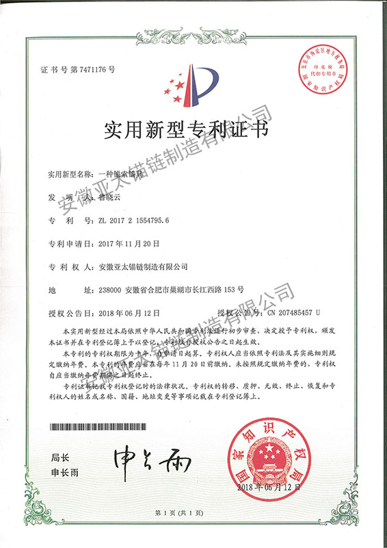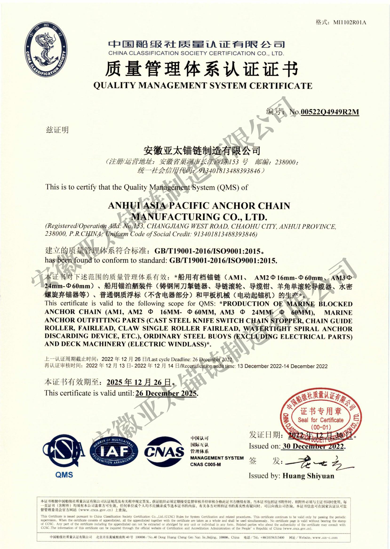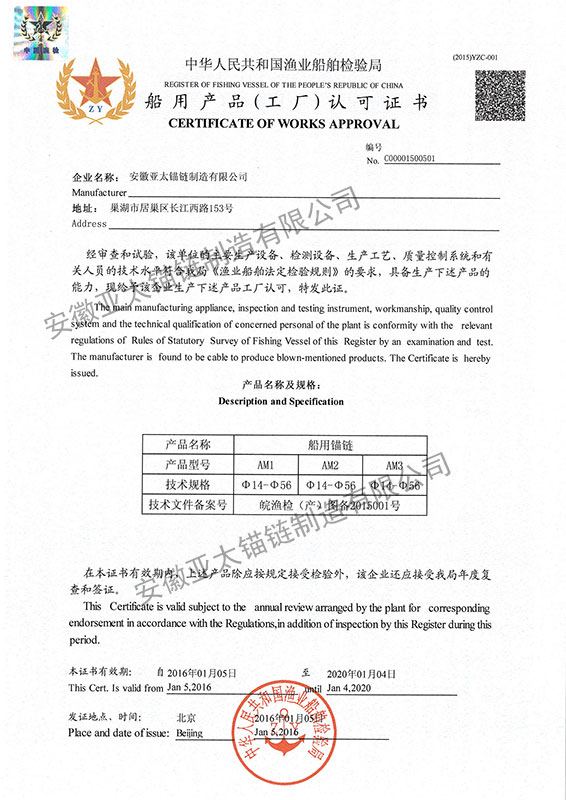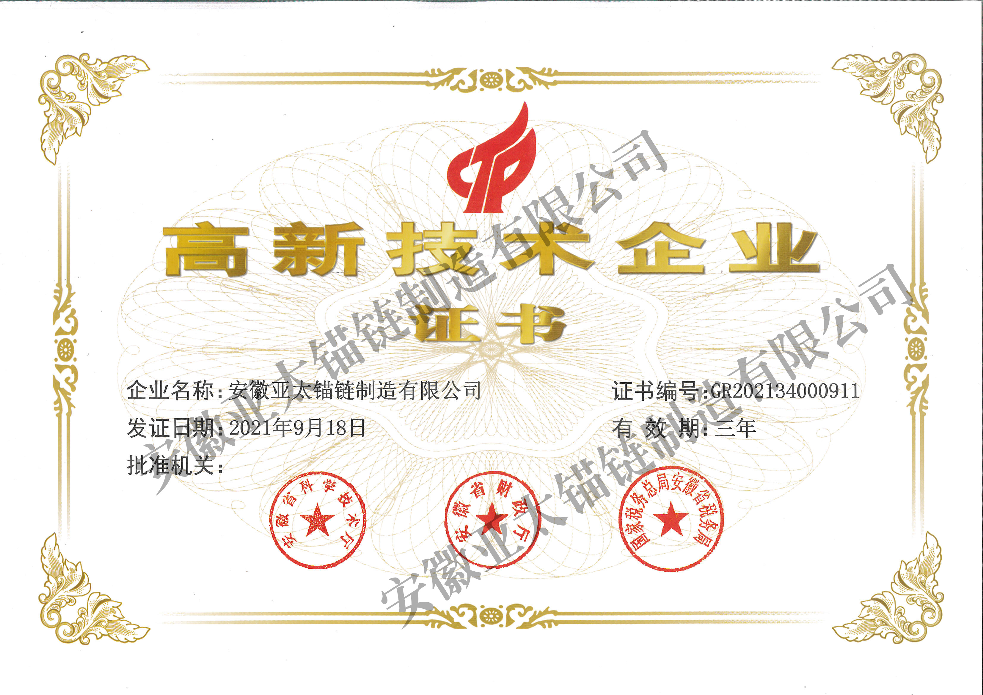 安徽亞太錨鏈制造有限公司是國家高新技術(shù)企業(yè),也是國家GB/T 549-2017《電焊錨鏈》標準的起草和制定單位之一。公司旗下設(shè)有錨鏈分廠、浮標分廠、舾裝件分廠等多個分廠。公司專業(yè)從事φ12.5mm-φ107mm二、三級船用錨鏈、浮標錨鏈、錨鏈附件,錨、船舶曬裝產(chǎn)品、航標、系船浮、船型標、多種規(guī)格海洋監(jiān)測浮標及航標燈等產(chǎn)品的生產(chǎn)、安裝和服務(wù)。目前公司的產(chǎn)品銷往全國各地船廠、碼頭、航標處、航道局、海洋局,并已走上國際市場,如東南亞、中東、歐美等國家。
